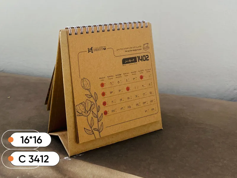 | تقویم رومیزی کرافت | کاغذ کرافت، کاغذ تجدید پذیر، پایه مقوایی کرافت ضخیم یا هارد کرافت | حس طبیعی و ساده، طراحی دوستدار طبیعت، بدون استفاده از رنگهای براق | مناسب کسبوکارهای سنتی، محصولات ارگانیک و محیطهای خلاق |